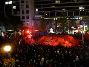 Commissioned for Toronto’s Nuit Blanche, 2010, and conceptualised and executed by Gisèle Gordon and Kent Monkman, Iskootāo was a site-specific sound and light installation with live performance that transformed a 650-tonne billion-year-old chunk of the Canadian Shield in Toronto’s Yorkville Park into the pulsing heart of the earth.